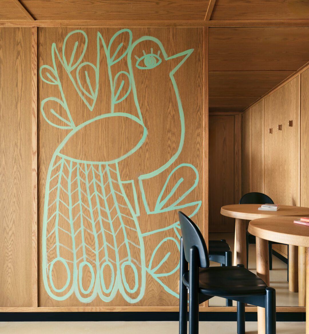 “I had spent a night in this hotel before it became an Ace Hotel ten years ago, on the occasion of holidays in Greece on my way back from Syros. The mural looks like an evocation of the clichéd Riviera of the 1960’s and deals as well with a nostalgia of a much more recent time when summer was a balmy omen. A hotel, a room apart, a room of one’s own, a room with a view, overlooking the sea, the horizon and the sky. The sky as a swimming pool. The extra window for a diving board. This wall painting is also a tribute to David Hockney into whose paintings one would love to dive.” — Claire Manent
