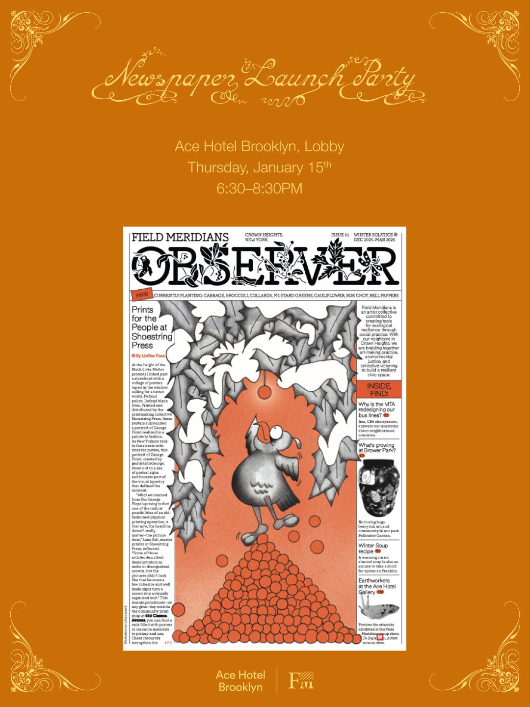 Join us in the Gallery for a launch party celebrating the debut of Field Meridians OBSERVER, a quarterly neighborhood newspaper highlighting local news and multispecies, seasonal perspectives. Published out of Crown Heights, Brooklyn at the turn of each season, the publication of the first issue of the newspaper includes a special section highlighting the exhibition and artists featured in Dig a Hole…A Nest, the Field Meridians’ show in the gallery of the Ace Hotel Brooklyn on view until January 31st.