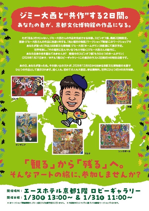 画家・ジミー大西さんの作品に色塗りをする、「色と場所の物語」ワークショップ開催!このワークショップであなたが塗った「作品」は京都文化博物館 ジミー大西「ホームタウン」京都展にて展示予定。