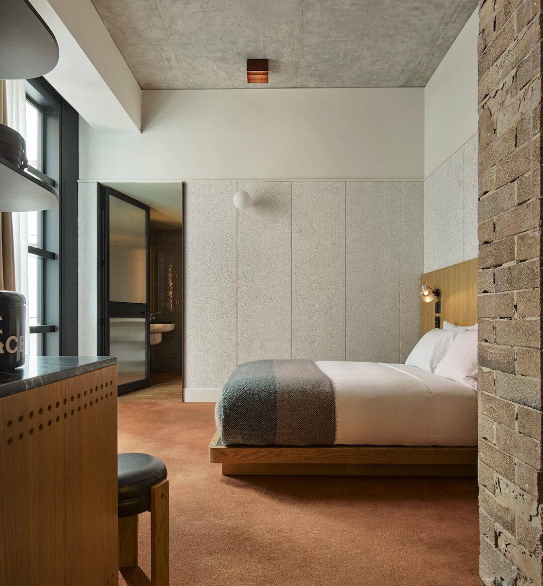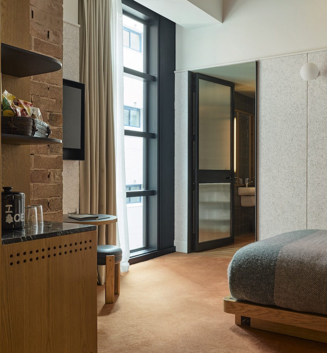 Ample space with an accessible queen or king bed and private bathroom with wheelchair-accessible shower. Rooms come with a curated minibar, casting-compatible HD television and a custom Tivoli radio, an accessible multiuse table with a pair of chairs and a large wardrobe. Approx. 24-35 square meter/255–380 square feet. For any accessiblity questions, drop us a line at reservations.syd@acehotel.com.