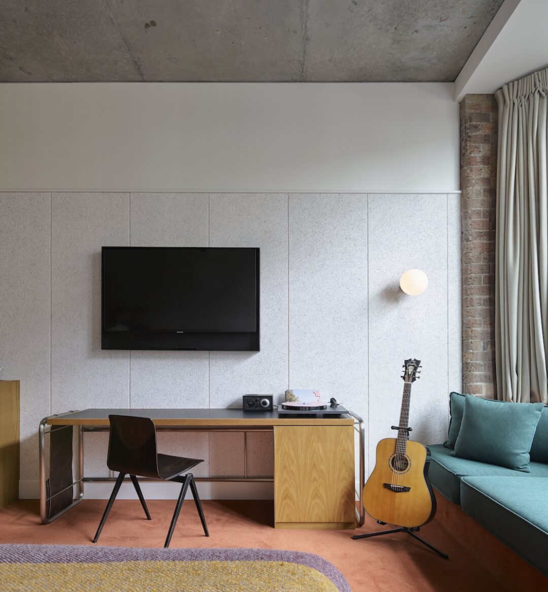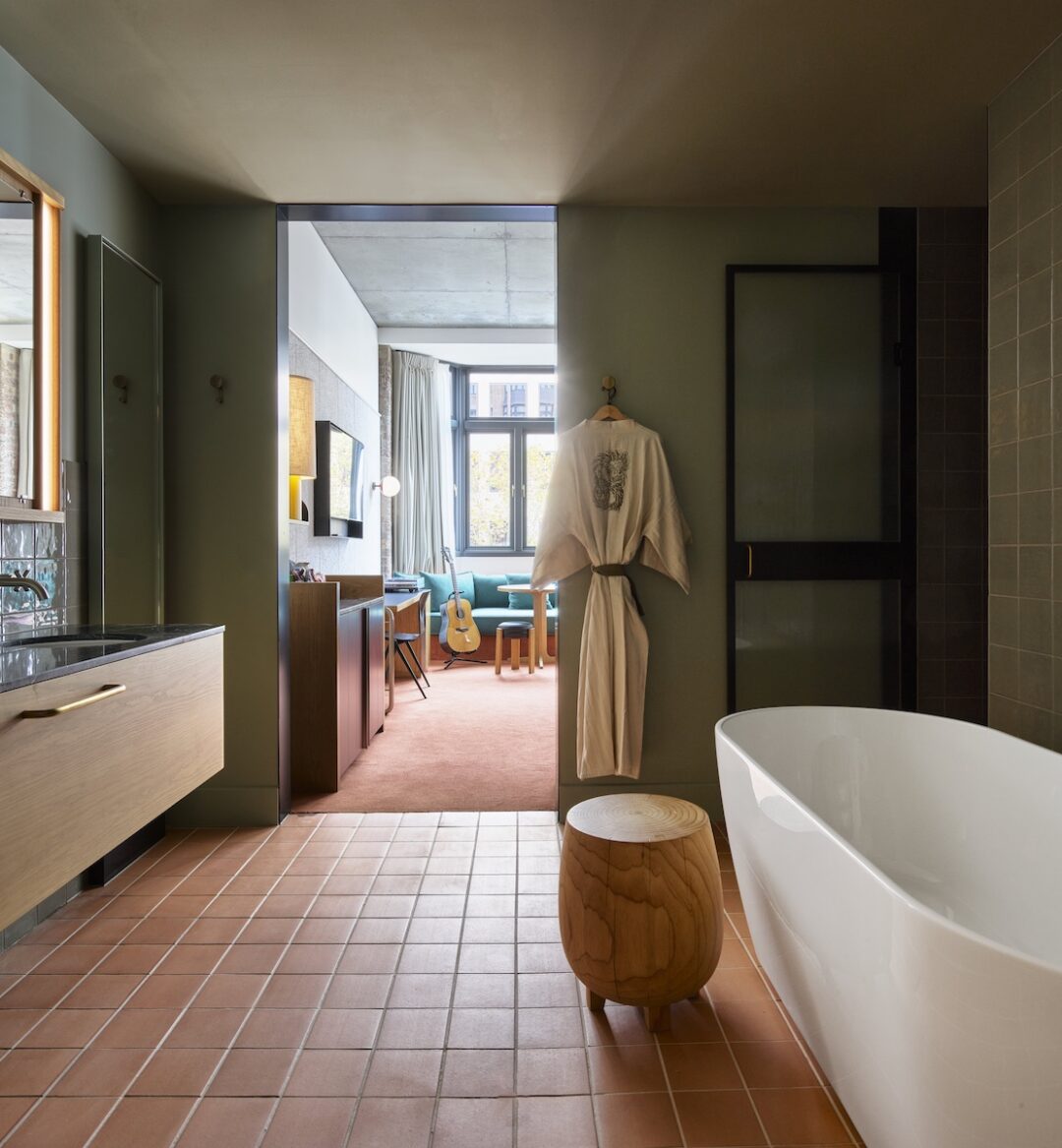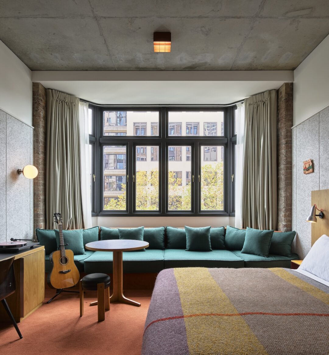 Our sunny, spacious Large rooms come with a king bed, extra-high ceilings, original brickwork features, a free-standing bathtub plus walk-in shower with eco-friendly bath and shower products, dual sinks, a daybed, large wardrobe and custom work desk. Includes Rega turntables with selection of curated vinyls, D’Angelo Acoustic Guitar, a flat screen television and custom Tivoli Radio. Approx. 35–39 square meters/375–420 square feet.