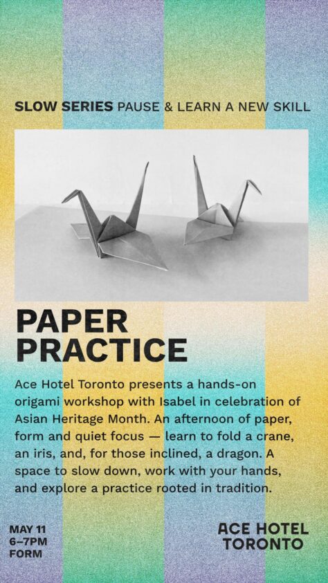 Ace Hotel Toronto presents a hands-on origami workshop with Isabel in celebration of Asian Heritage Month. An afternoon of paper, form and quiet focus — learn to fold a crane, an iris, and, for those inclined, a dragon. A space to slow down, work with your hands, and explore a practice rooted in tradition.