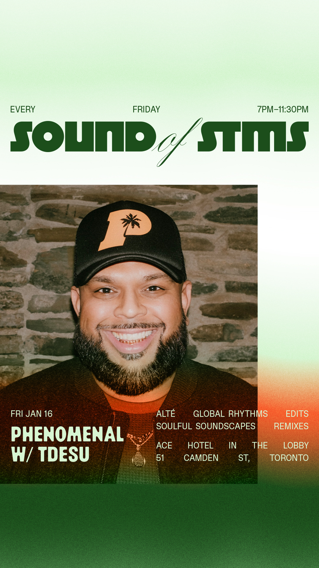 Stms (pronounced “Stems”) is a platform showcasing DJs, music producers, & remix culture through events in Toronto. Launched in 2023 by organizer Tdesu, Stms has hosted over 20 events featuring some of Canada’s top sound selectors and international guests from New York, Antwerp, Melbourne, and more. “Sound of Stms” invites a different guest DJ every Friday alongside Tdesu—for a curated evening of soulful sonics to Ace Hotel in The Lobby ranging from Alté, global rhythms, R&B, jazz, deep grooves, edits/remixes, and…